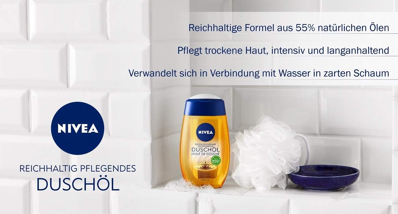 Box contents and details: Nivea rich nourishing shower (200 ml), rich and nourishing shower gel with natural len and vitamins, item no. 80828